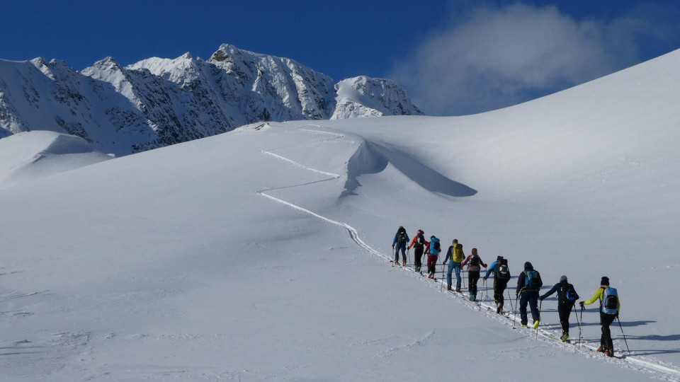 22.3. Abfahrt um 8.30 Uhr Richtung Norden ca 50km nach Solstad – zuerst flach durch die Baumzone und schöne westseitige flache Hänge – nachdem dieser Hang sehr verlockend war machten wir die 1.Abfahrt nach 220HM – wieder anfellen und aufsteigen Richtung Stetinden welcher am flachen Sattel wegen starkem Wind und eisigem Gipfelhang abgebrochen wurde – Abfahrt bei schlechter Sicht in den Kessel und nochmals anfellen und Aufstieg zum Rundfjellet – Abfahrt bei guten Schneeverhältnis aber wenig Sicht ins Kar wo anschliessend die Sicht besser wurde und die herrliche Aussicht über die Lyngenalps und auf den Ullsfjorden sich auftat.