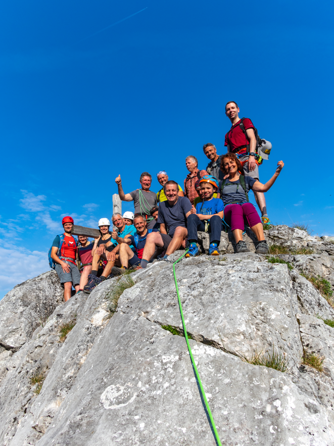 Von der Kienklause über den Normalweg zur Hohen Rast, dann weiter zum Adlerspitz (der Anstieg wird mit Fixseilen versichert ) und dann weiter über den Kugelzipf (der Kamin wird ebenfalls mit Fixseilen versichert) zum Hochleckenhaus . Anschließend Bergmesse der Naturfreunde Lenzing/Timelkam und der Marktmusik Timelkam.